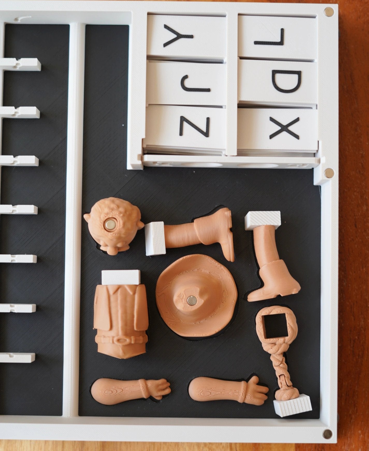 - Всеки елемент на човечето има магнит, буквите имат собствени слотове – нищо няма да се загуби
