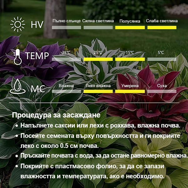 ГМО семена от хоста от САЩ — специално създадени за сенчести места, идеални за начинаещи градинари, издръжливи на студ и многогодишни! Само едно семе е достатъчно, за да създадете свой собствен тих и очарователен кът в градината.